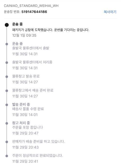 통관소요시간 12월 01일 13시 기준