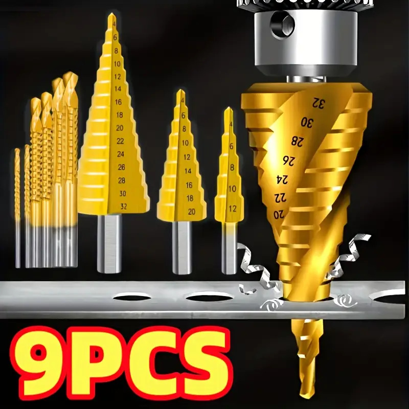 9피스 스텝 드릴 비트 세트, 타워형 멀티 레벨 홀 오프너가 포함된 금속 드릴링 키트 - 목공 및 코어 드릴링용 고정밀 코어 보링 도구