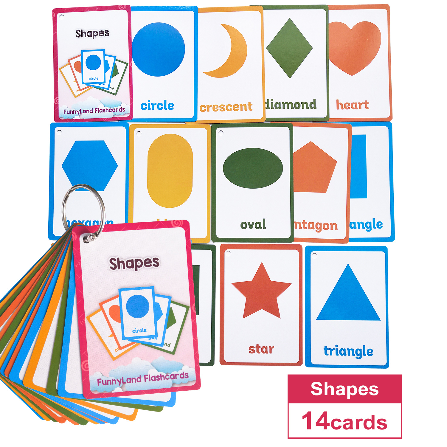 3세 이상 어린이를 위한 14개 플래시 카드 세트 (모양 및 영어 단어 학습용) | 유아 교육 및 홈스쿨링을 위한 시각 교육 도구 | 교육 이미지 카드