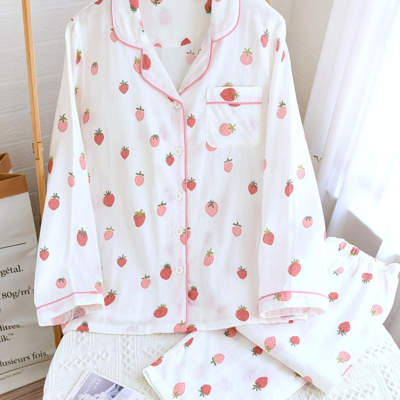 일본 스타일 여성용 파자마 세트, 더블 가즈로 제작되었으며 딸기 디자인으로 구성되어 있습니다. 이 잠옷은 100%로 제작되어 부드러움과 통기성을 보장하며 편안한 편안한 착용감을 제공합니다.