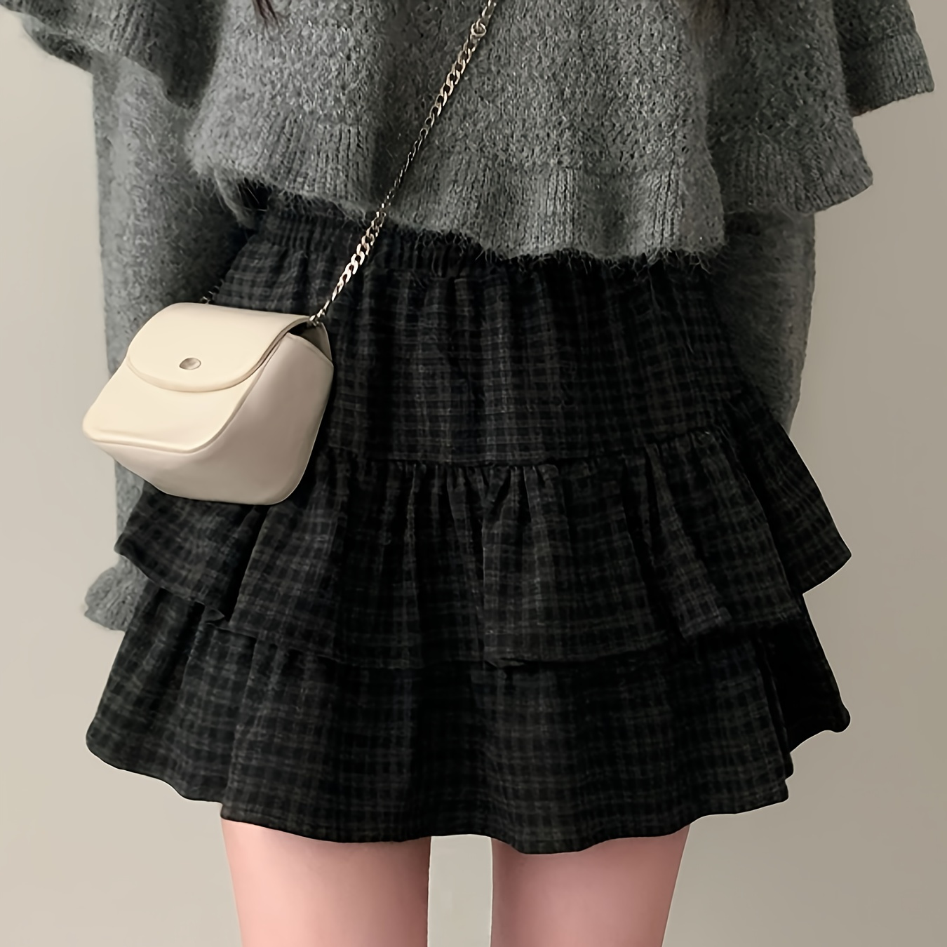 2026 봄/가을 신상 빈티지 체크 무늬 레이어드 러플 숏 스커트 여성용, 하이웨이스트 슬림 A라인 미디 스커트, 데일리 데이트 및 출퇴근에 트렌디하고 활용도 높은 패셔너블 케이크 스커트