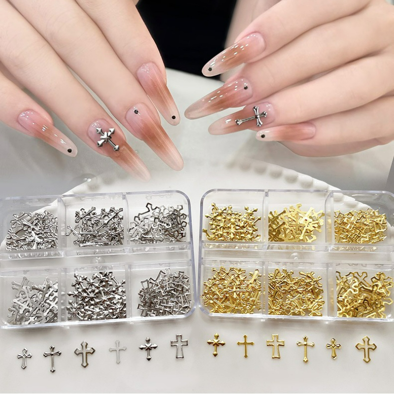 6구획 십자형 네일 데코레이션 세트 박스 - 골드 & 실버 리벳 시트 포함, 3D 합금 네일 아트 액세서리, 매니큐어용, 네일 아트 용품, 우아한 네일 디자인, 내구성 있는 네일 아트
