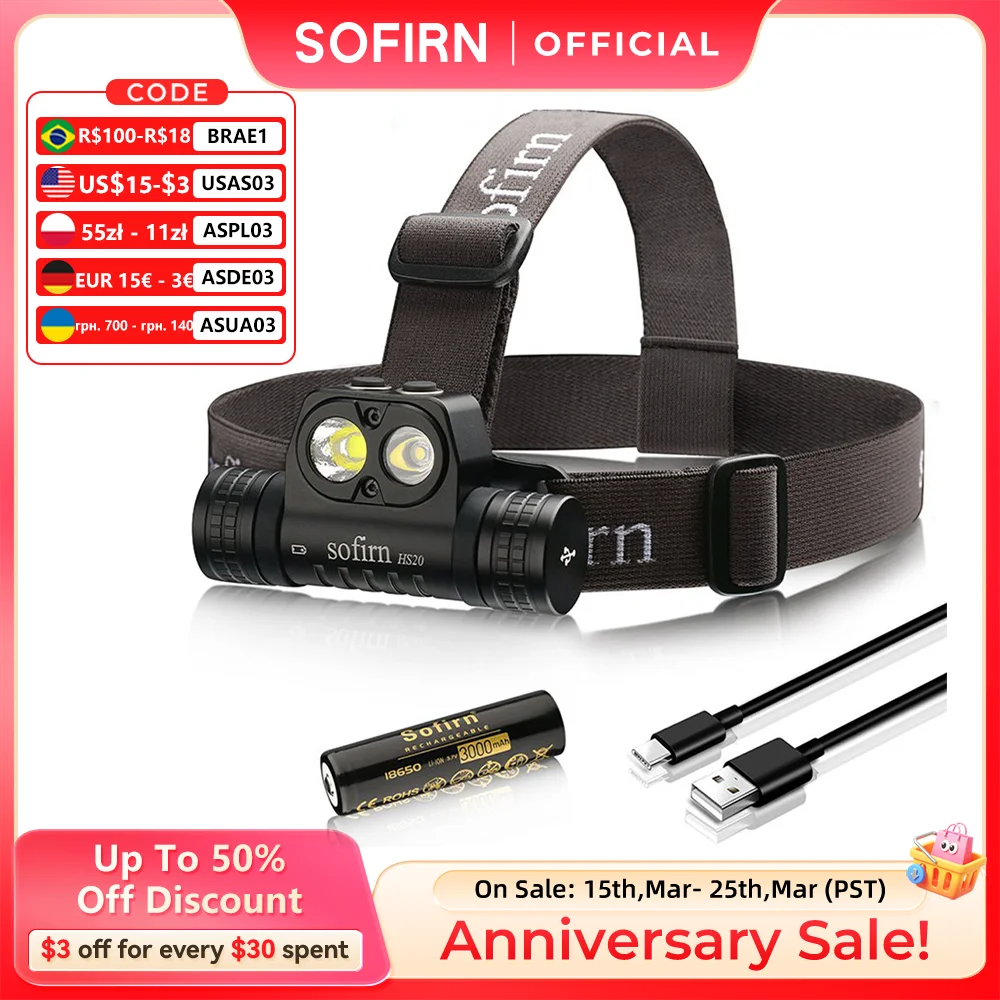 Sofirn HS20 2700lm USB C 충전식 LED 헤드램프 18650 스포트라이트 및 투광 조명 듀얼 스위치 표시기가 있는 강력한 헤드라이트