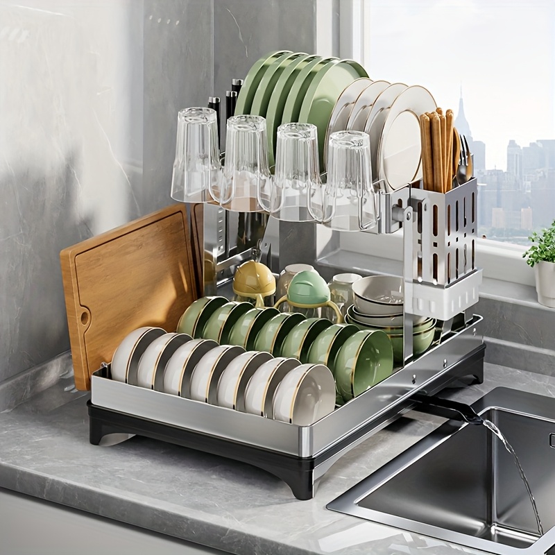 접이식 스테인리스 스틸 식기 건조대, 공간절약형 주방 정리대, 배수구 포함, 2단 접이식 그릇 컵 홀더, 컴팩트 & 내구성