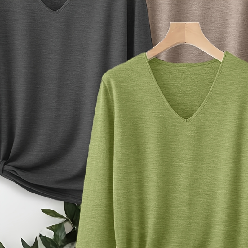 3가지 단색 무지 V넥 긴팔 티셔츠, 봄/가을용 미니멀리스트 스타일 여성 탑, 편안하고 캐주얼한 기본 아이템으로 데일리 출퇴근 또는 캐주얼 외출에 적합, 통기성 좋고 세탁기 사용 가능