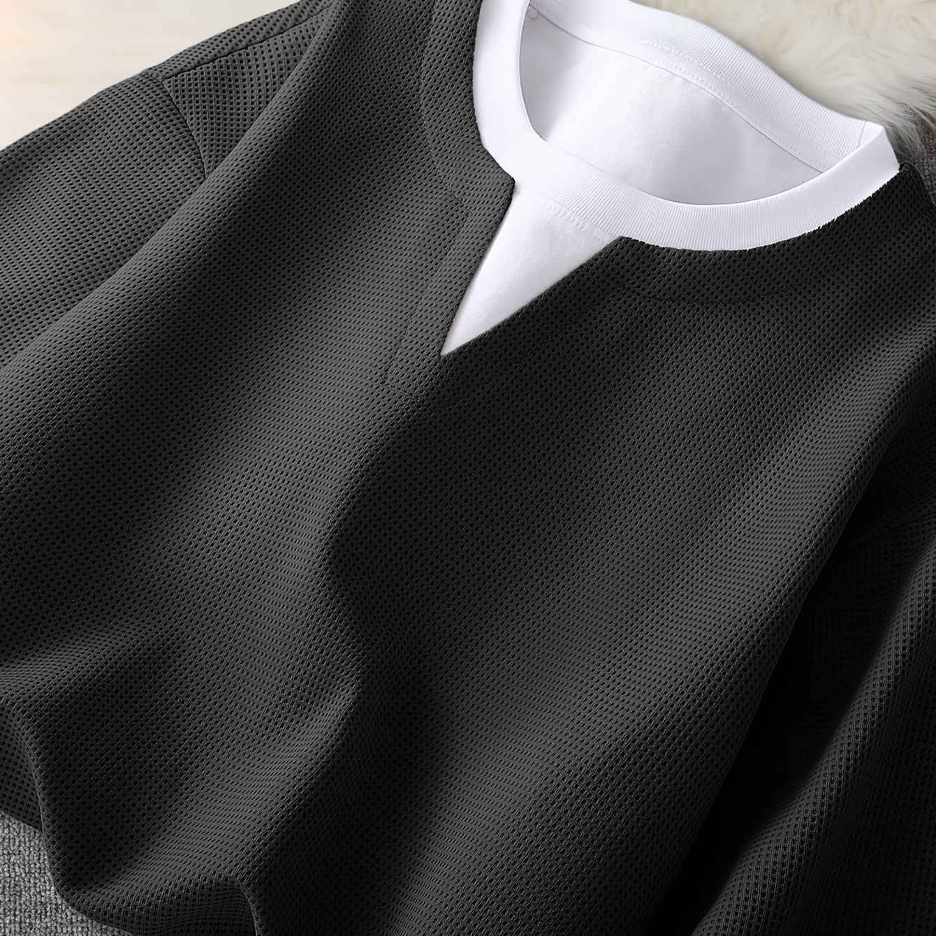 남성용 와플 2-in-1 룩 반팔 티셔츠, 입체 체크 패턴, 레이어드 칼라 스플라이싱 디자인, 스포티 캐주얼