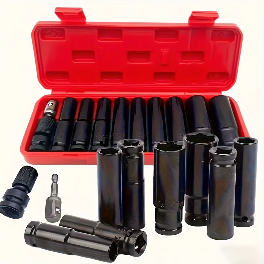 탄소강으로 제작된 어댑터가 포함된 1/2" 임팩트 소켓 11개 세트. 10~24mm의 육각 공구가 특징이며, 자동차 수리용으로 설계되었으며 휴대용 보관 케이스가 포함되어 있습니다.