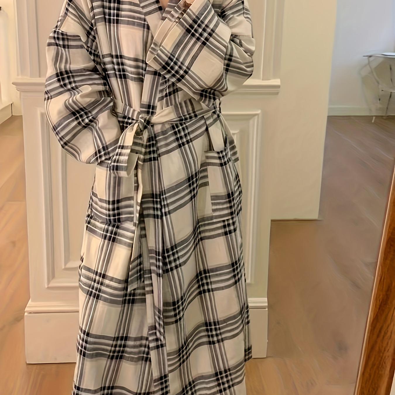 여성용 신상 루즈핏 긴팔 캐주얼 홈웨어 로브, 봄/가을용 간편한 체크무늬 디자인