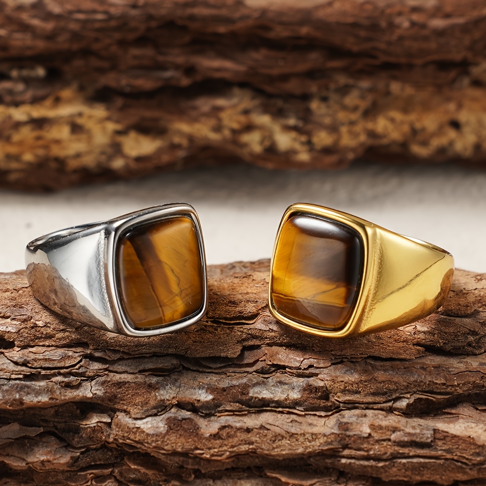 이 반지는 천연 호랑이 눈을 특징으로 하며, 내구성이 뛰어난 316L 스테인리스 스틸로 제작되었으며, 변색 방지 금 도금 처리되어 용감함과 보호를 상징하며, 일상적인 사용에 이상적입니다.