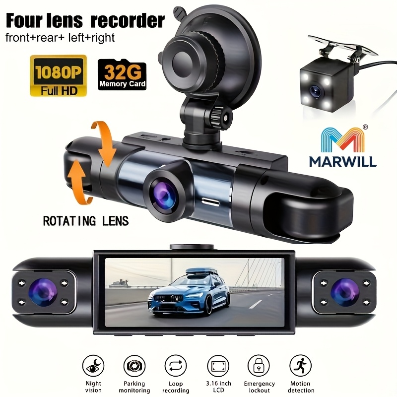 360° 차량용 블랙박스, 완전 4채널 디자인, 전방 1080P 풀 HD 카메라 및 후방/좌/우 720P 품질. 3.16인치 IPS 디스플레이, 회전 가능 렌즈, 야간 투시 기능, 루프 레코딩 기능 포함.