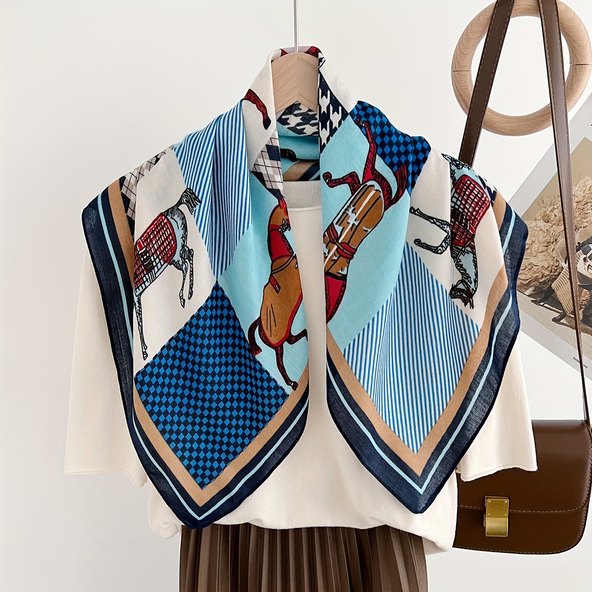 일상적인 캐주얼용으로 사용하기 좋은, 작은 말 패턴이 있는 섬유 소재의 작은 사각 스카프