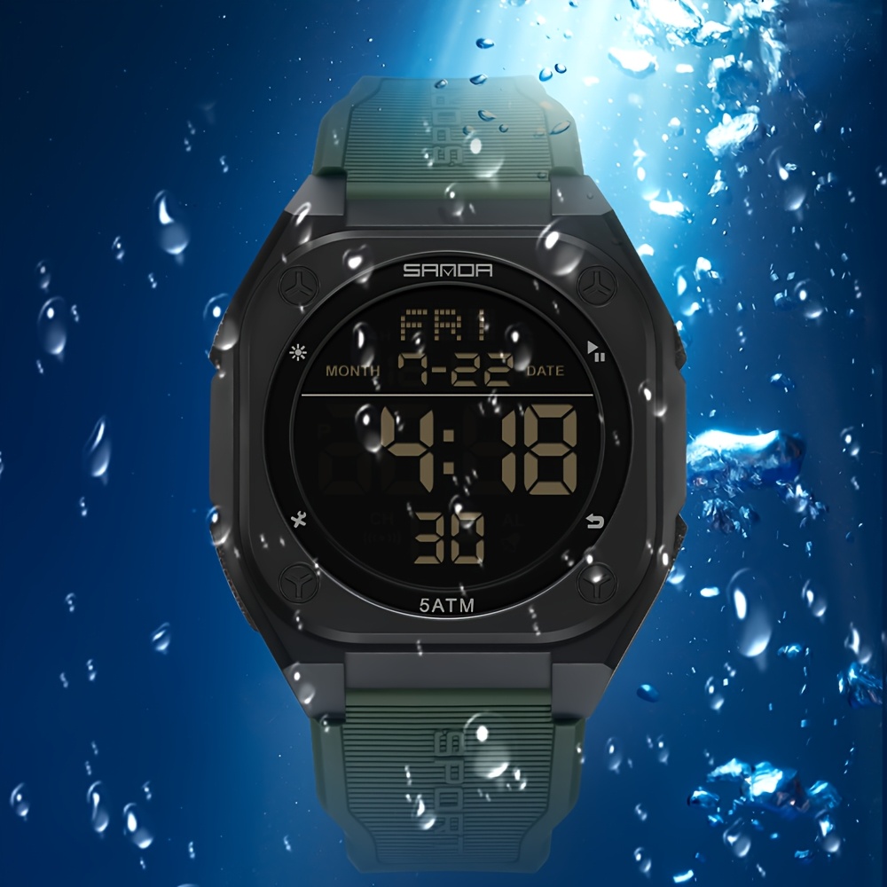 이 남성용 시계는 정교하게 제작된 사각 케이스를 특징으로 하며, 이중 시간대 표시, 카운트다운 타이머, 고정밀 스톱워치, 진동 알람을 제공합니다. 전자 캘린더 및 방수 기능이 있습니다.