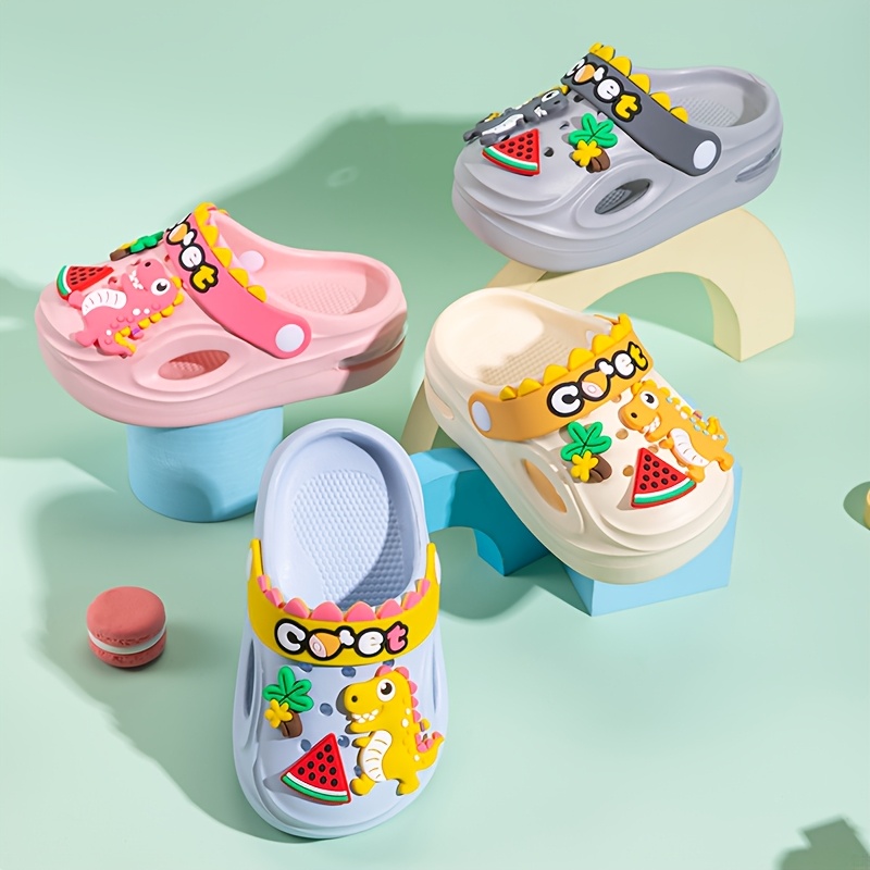 재미있는 공룡 수박 만화 장식 아동용 나막신, 여름용 귀엽고 편안한 밑창이 부드러운 남녀공용 슬리퍼, 실내/실외용 남녀공용 나막신