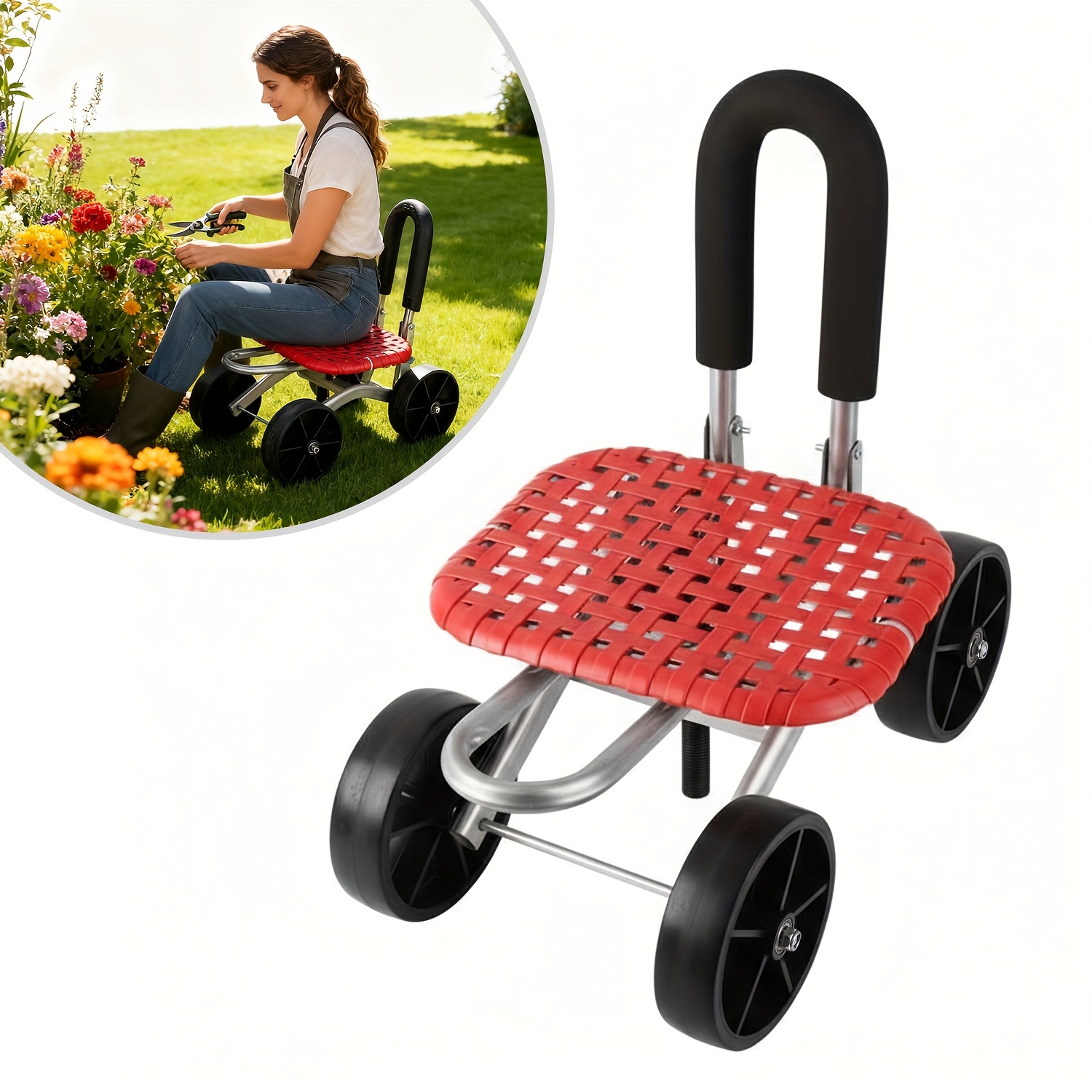 정원용 카트 롤링 스툴, 네 바퀴 안정적인 작업용 의자, 조절 가능한 좌석 높이 및 방향, 정원 작업 도우미