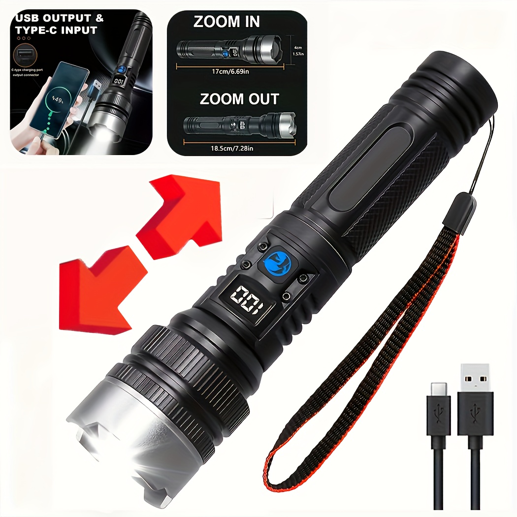 고루멘 LED 충전식 줌 손전등, 1200mAh, 디지털 배터리 디스플레이, Type-C 충전, 다중 모드, 공원, 트레일, 차고, 야간 러닝용, 손목 스트랩 포함, 크리스마스 선물, 야외 활동 필수품