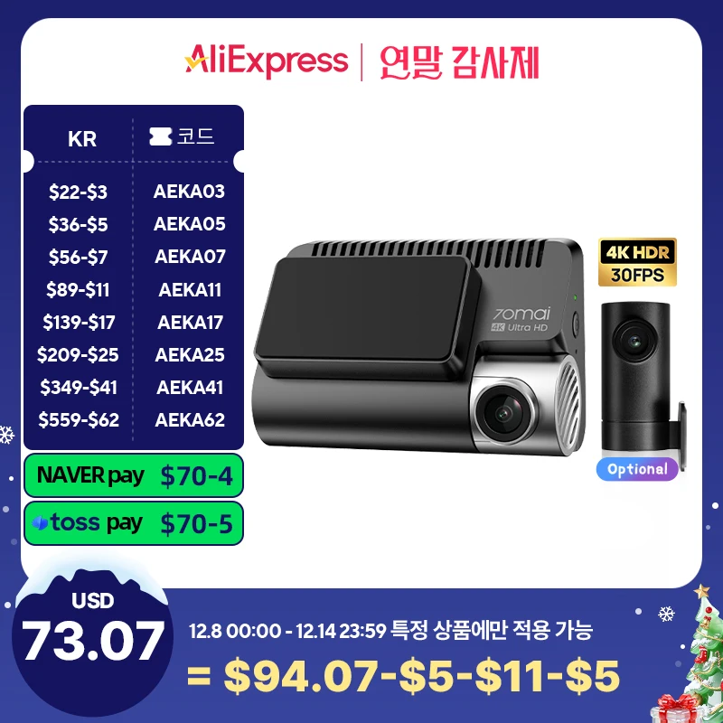 70mai A800SE 대시캠 4K UHD 시네마급 내장 GPS ADAS 70mai 4K A800SE 24시간 주차 지원 후방 카메라 지원