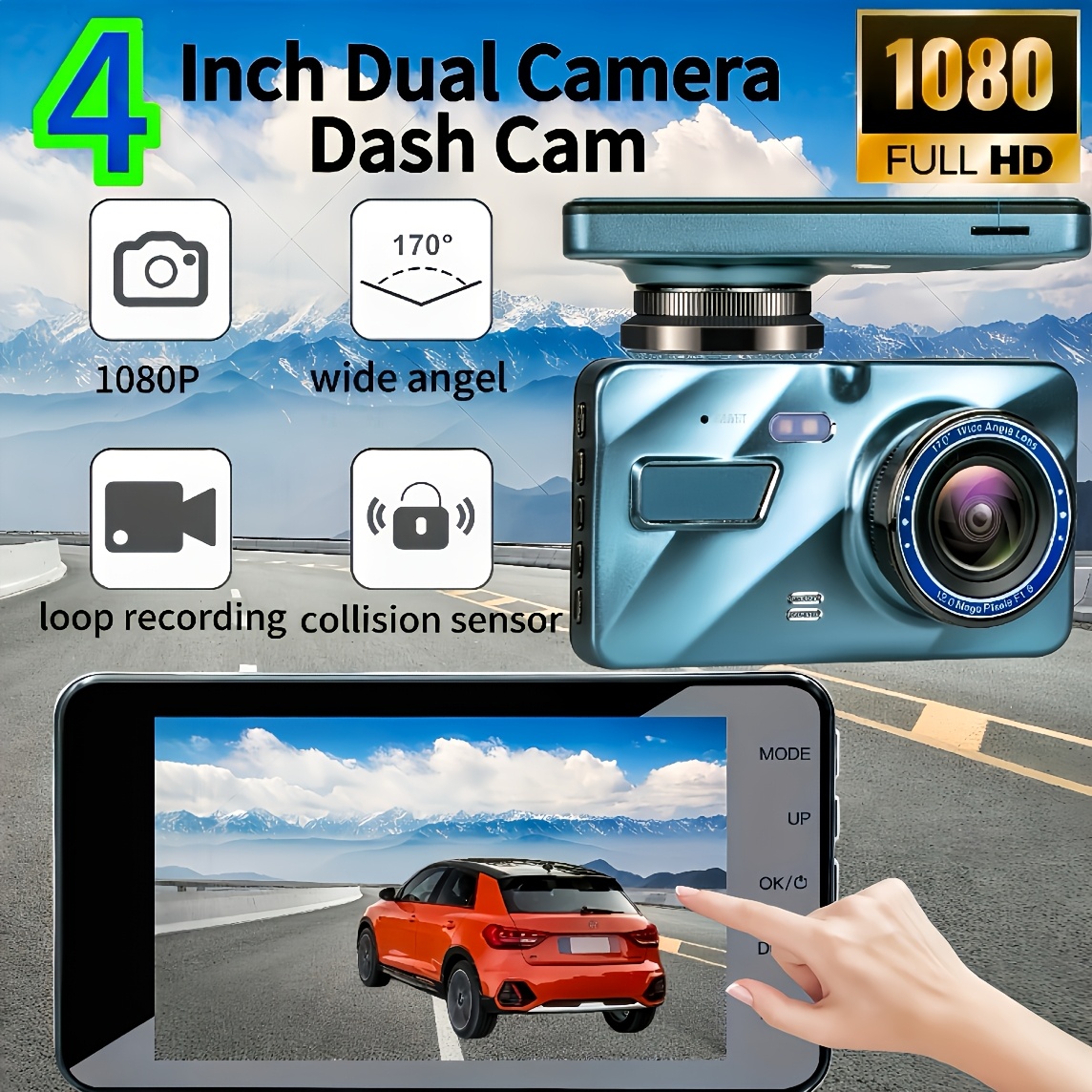 특징 있는 4인치 듀얼 레코딩 블랙박스: 전방 1080FHD, 메탈 백플레이트, 야간 투시경, 주차 감시, 후방 이미지, 루프 레코딩, 170° 광각. 세단, SUV, 트럭, 라이드 헬링 차량 등에 적합. 간편한 설치! Stro