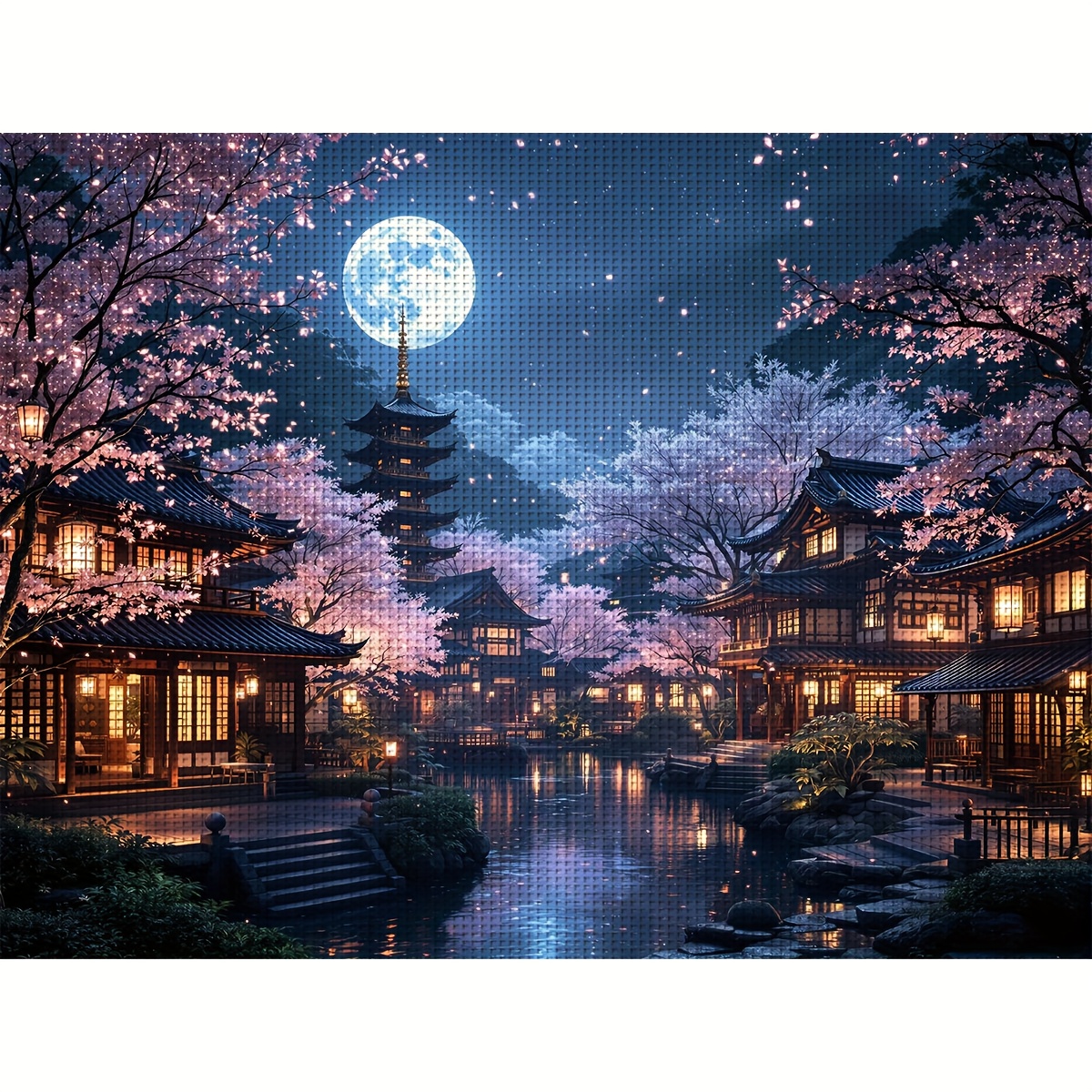 1개 40x60cm/15.7x23.6인치/40x70cm/15.7x27.5인치 호숫가 벚꽃 탑 풍경 패턴 11CT/14CT 프린트 원단 크로스 스티치 DIY 키트, 성인 초보자를 위한 편안한 자수 키트 (원단, 바늘, 실, 도면 및 설명서 포함), 수제 벽 장식 작품