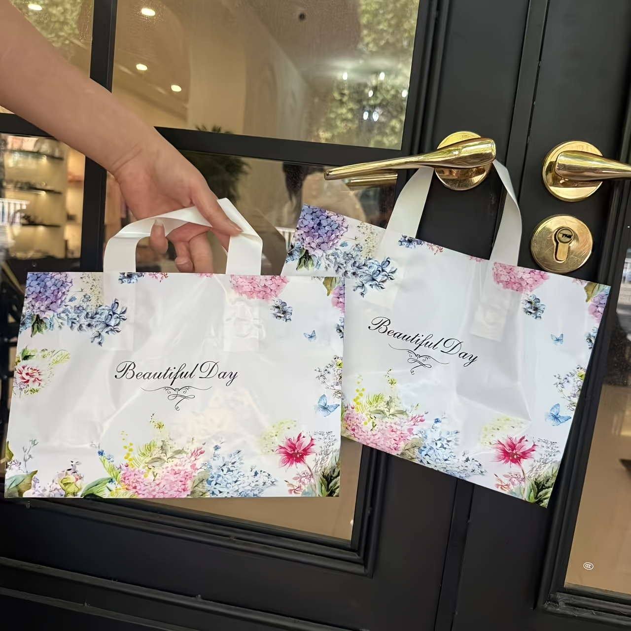 50개 팩 나비 라벤더 꽃형 플라스틱 선물 가방 - 세련된 흰색 & 파란색 디자인으로 패션, 쇼핑, 파티, 결혼식, 생일, 특별한 기념일을 위한 내구성 있는 손잡이, 선물 가방