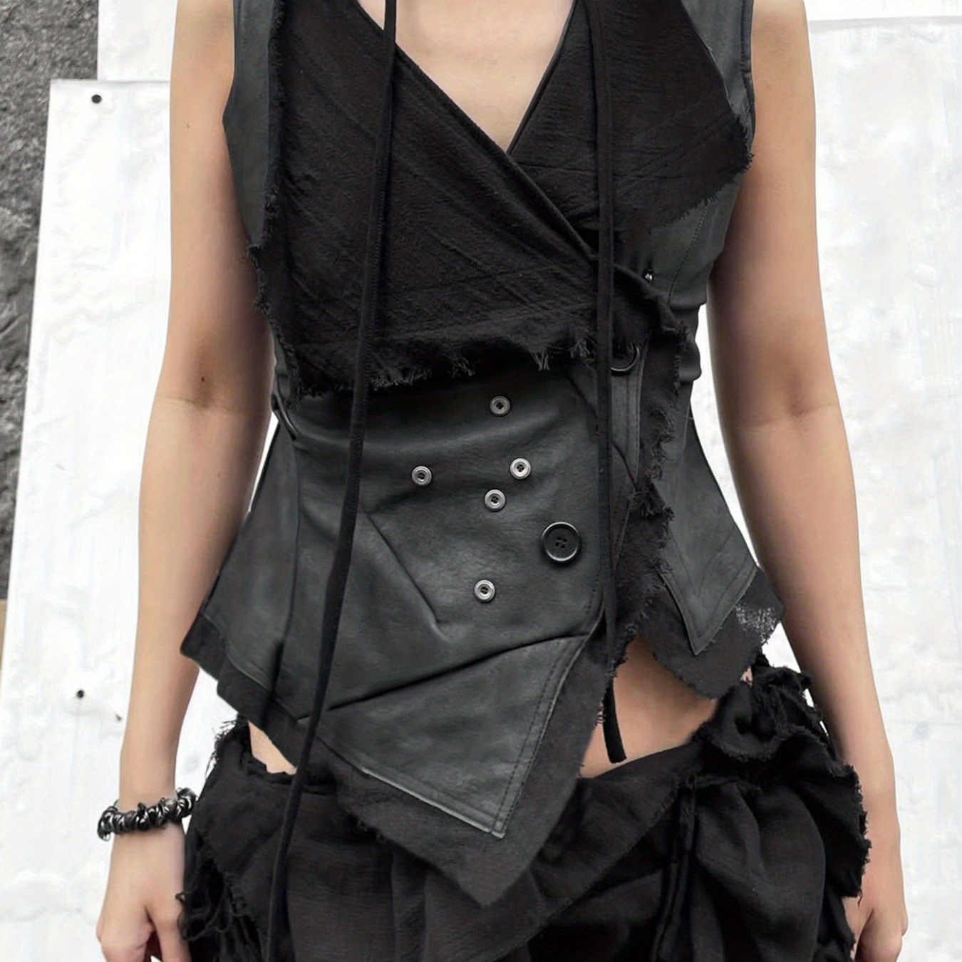 아сим메트리한 밑단의 버튼 앞면 조끼, 다크 미드일 스타일의 합성 소재로 제작된 레이어드 디자인.
