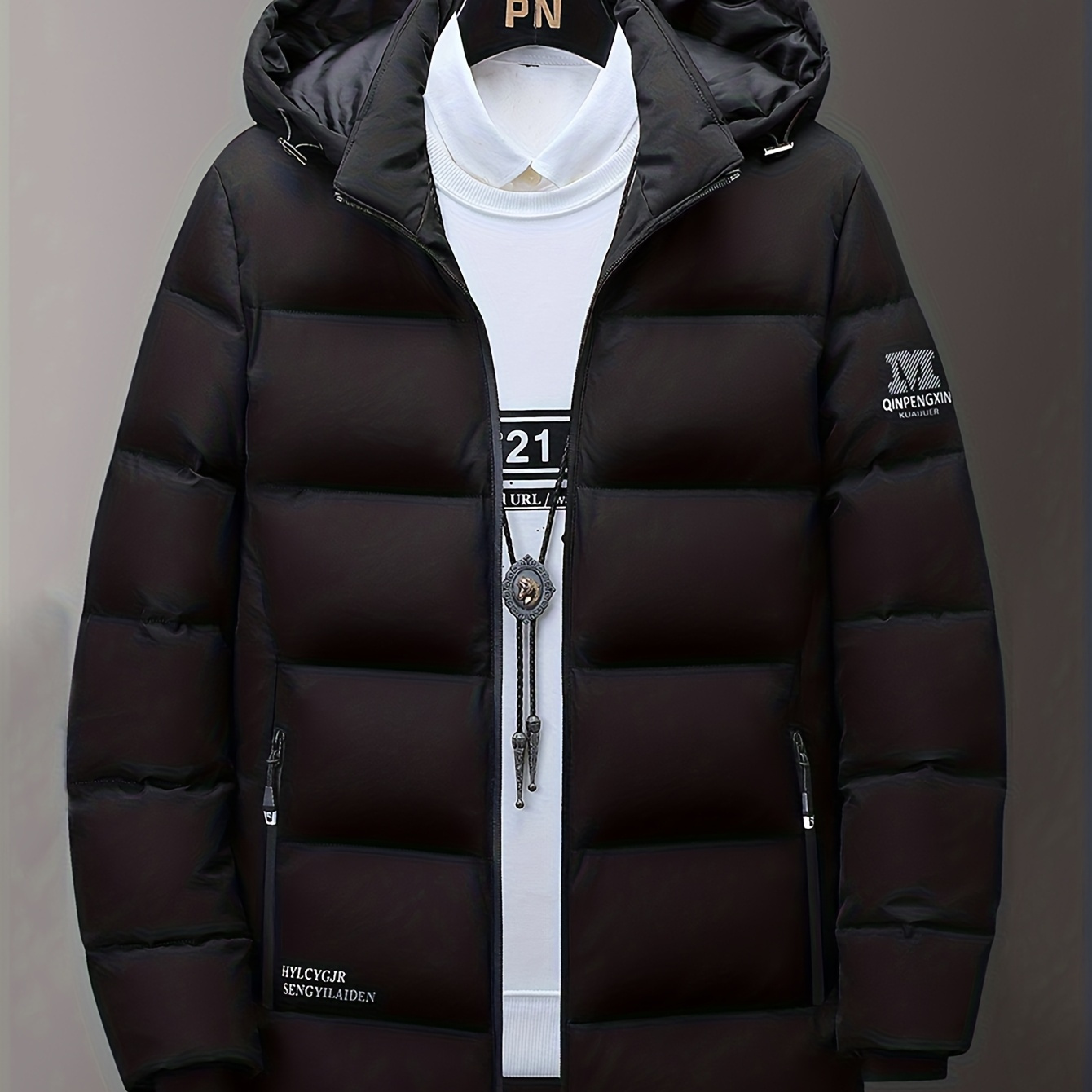 남성용 겨울 후드 두꺼운 미디 기장 코트 | 캐주얼 스타일, 신축성 없는 원단, 알파벳 패턴, 포켓, 레귤러 핏, 섬유 충전재