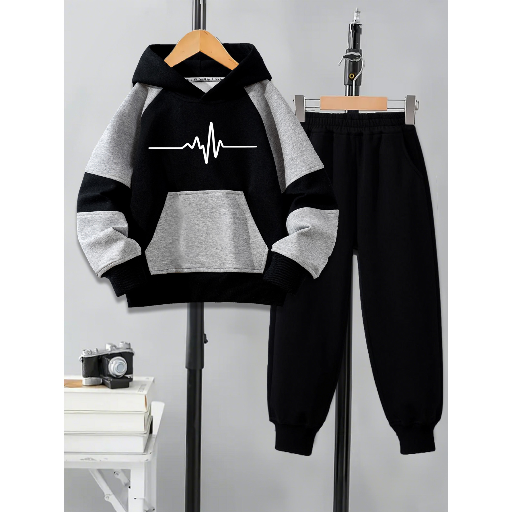 2pcs 아동용 블랙 그레이 후드티 세트 | 흰색 심박도 그래픽 블랙 바지, 컬러 블록 디자인, 긴소매, 캐주얼 데일리 웨어, 남아 여아 스포츠 의류, 십대, 가을 겨울, 야외용
