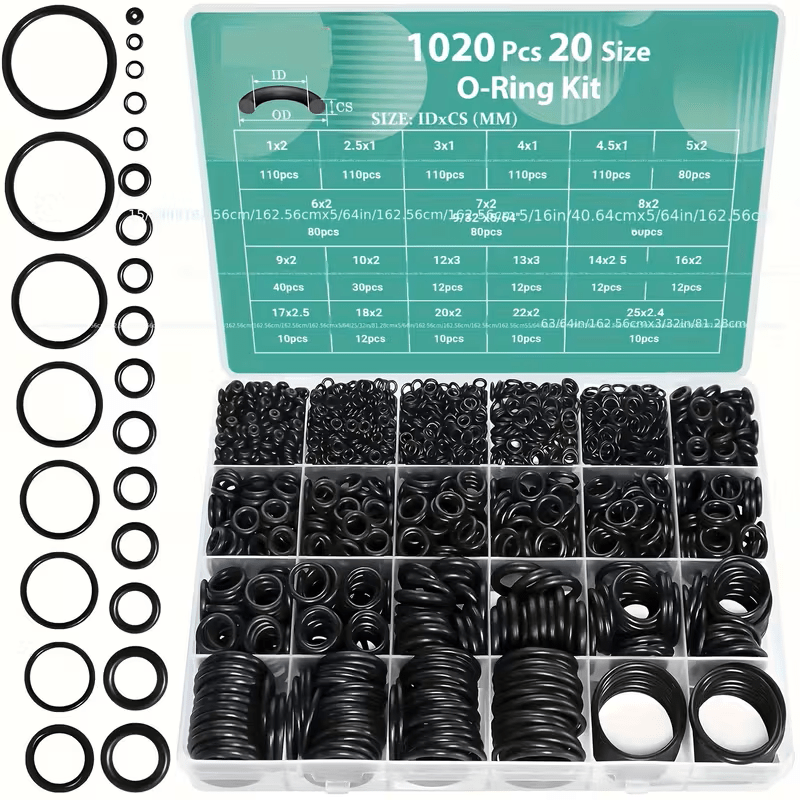 니트릴 고무로 제작된 20가지 다양한 크기의 O링 1020개 세트. 자동차 수리, 배관, 공기 또는 가스용 밀봉 연결에 적합하며, 오일 및 열에 저항합니다.