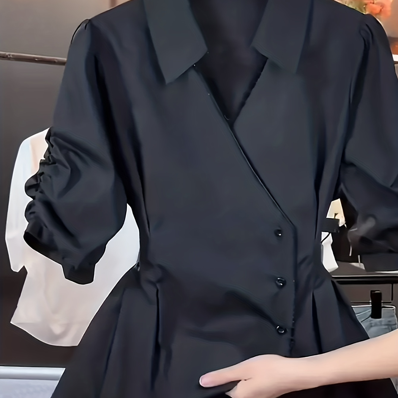 펑스 소매와 V넥이 특징인 우아한 여성용 블라우스. 슬림한 실루엣을 위해 핏팅 웨이스트와 플레어 헴을 디자인했습니다.