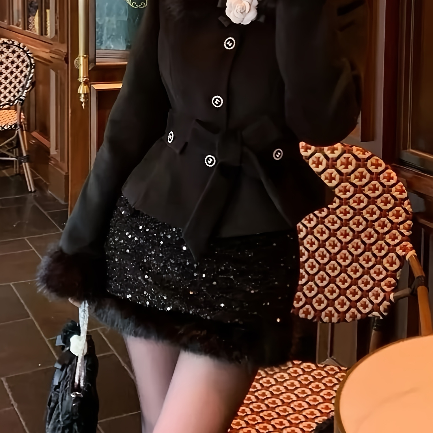블랙 럭셔리 트위드 2피스 세트 - 가짜 칼라 포함, 겨울용 고급 두꺼운 상하의 세트 (상의 + 스커트)