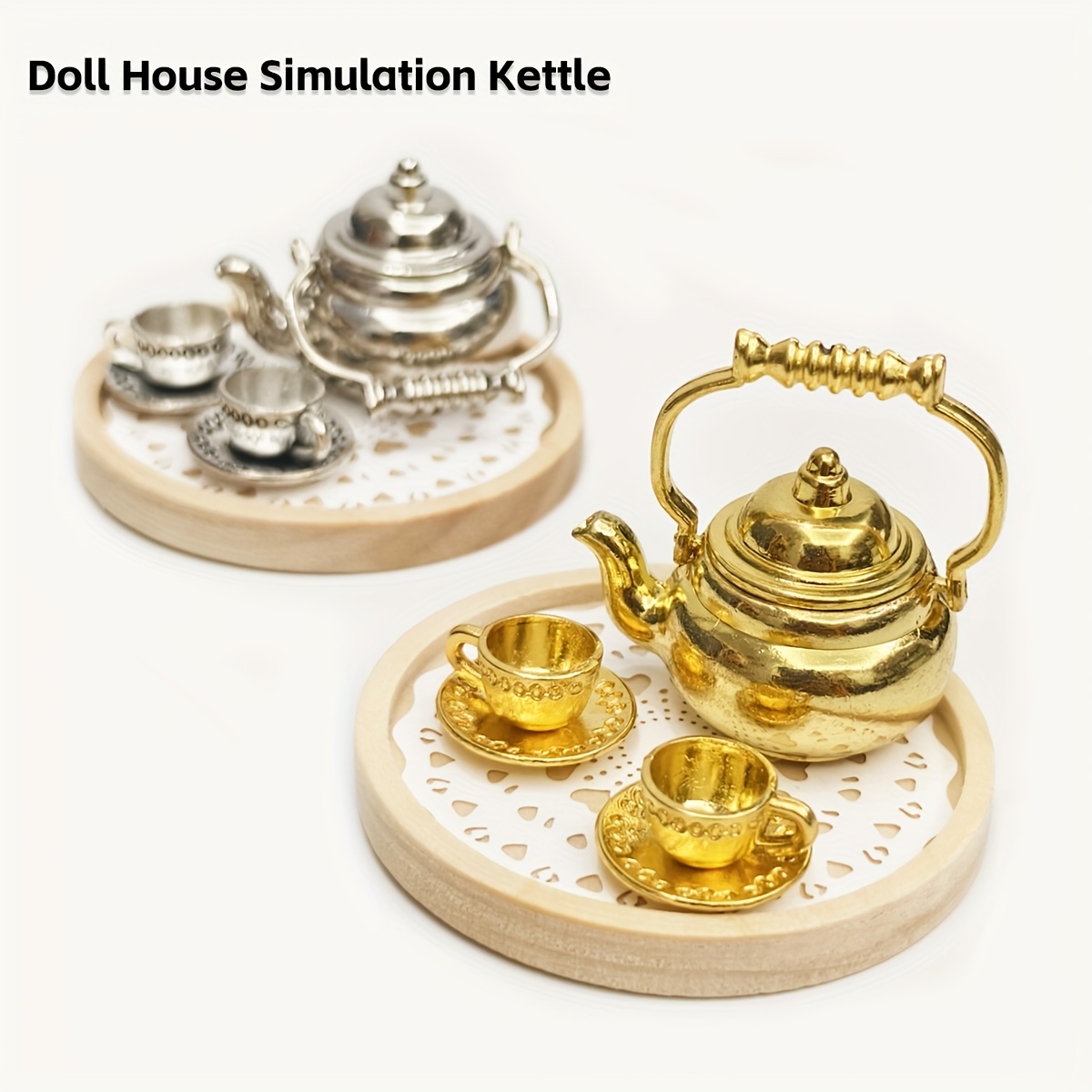 5개/인형의 집 시뮬레이션 주전자 세트, 나무 트레이 포함, 하트 모양 플래시매트, 금속 컵 2개, 1:12 미니어처 시뮬레이션 주전자, 티포트, 미니어처 장면 장식 모델, 주전자 뚜껑 개방 가능, 고급스러운 선물 세트! 인형의 집 액세서리 세트!
