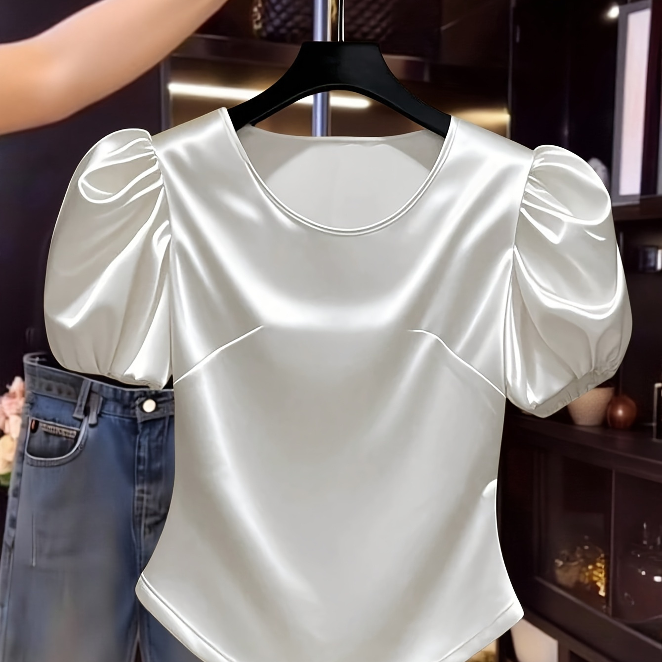 방향성 있는 우아한 캐주얼 라운드넥 퍼프 슬리브 여성 티셔츠