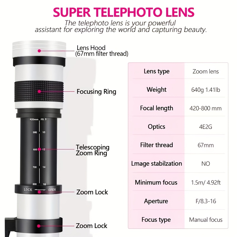 프로페셔널 등급 420-800mm F/8.3-16 수동 망원 줌 렌즈 - 캐논, 니콘 및 소니 DSLR 카메라 호환 T-마운트 어댑터 (풀프레임/APS-C) 야생동물 및 뉴스 사진용