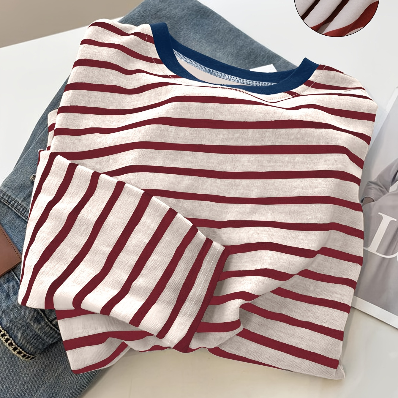 여성 캐주얼 스트라이프 루즈 라운드넥 긴팔 티셔츠, 다용도 베이스 레이어 탑 PB-1335-5